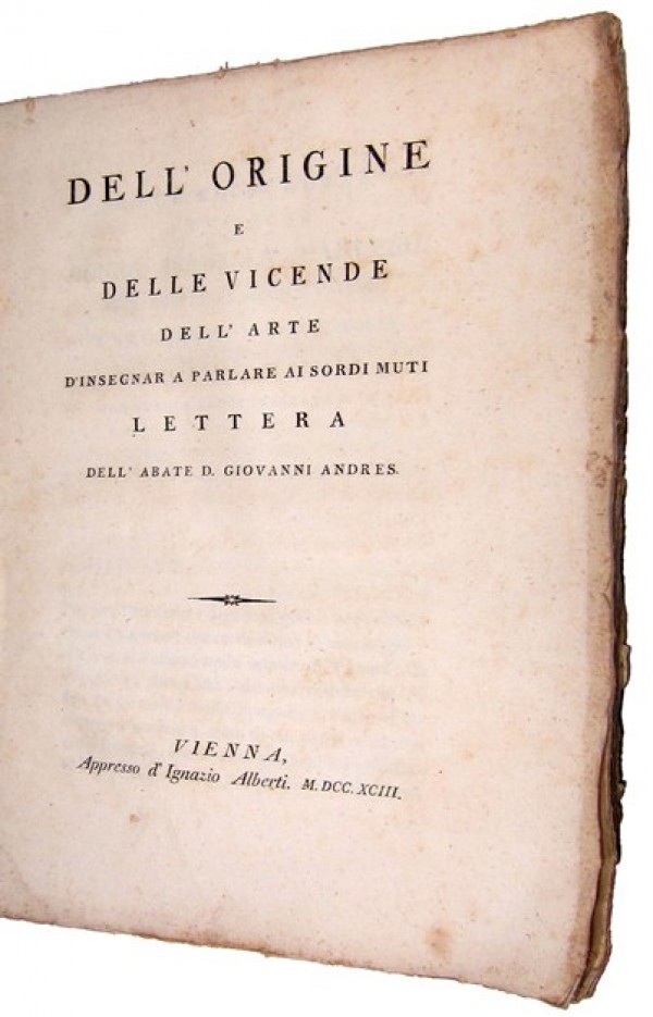 Legatura originale in brossura carta-zucchero con breve Sordomuti manoscritta al piatto anteriore. 62 pagine numerate, compreso il frontespizio La rara e curiosa opera � dedicata a Sua Eccellenza la Signora Donna Isabella Parre�o, Marchesa de Llano, Ambasciatrice di Spagna, Dama della Croce Stellata. L'autore, con rigore storico e ben argomentato, ribadisce il vanto degli spagnoli nell' aver inventato per primi l'arte di insegnare a parlare ai sordo muti, contrapponendosi ai suoi contemporanei viennesi e francesi i quali attribuivano la scoperta e il metodo al loro abate l'Ep�e, disconoscendo cos� il primato spagnolo ben pi� antico addirittura di due secoli. Infatti, l'autore cita quale fondatore del metodo il monaco benedettino Fra Pietro Ponce del monastero d'Ogna che, sul finire del XVI secolo, dopo molti studi teorizz� applicandolo un metodo efficace per far parlare ai sordo muti. Juan o Giovanni Andr�s, scrittore e storico gesuita spagnolo, nel 1767, quando l'ordine dei Gesuiti fu proibito in Spagna, Andr�s si trasferisce in Italia dove visse fino alla sua morte avvenuta a Roma. L'opera venne pubblicata in contemporanea anche a Venezia . Esemplare in buono stato conservativo, piccollisima lacuna al piatto posteriore coperta da tassello cartaceo beige, tracce di carta gommata a rinsaldare il dorso; interno fresco, in barbe.