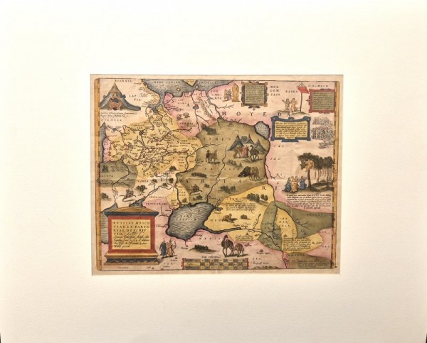 Incisione originale eseguita su matrice di rame in bella coloritura coeva eseguita all'acquarello; al verso, testo in latino. Sul lato inferiore sinistro titolo, dati editoriali e dedicatoria entro riquadro. L'opera di grande fascino ed eleganza è una carta geografica tratta dal più famoso atlante del Cinquecento, pubblicato da A. Ortelius e più volte ristampato con addimenta, prima edizione nel 1570. La mappa in esame rappresenta i territori dell'odierna Russia meridionale, Crimea, Mar Caspio, Persia e l'indicazione della città di Samarcanda. ll foglio reca brevi descrizioni dei luoghi abitati dagli antichi popoli di quei luoghi, sulla scorta delle testimonianze degli storici e poeti greci e latini. Esemplare in buono stato conservativo a pieni margini, dalla leggera uniforme ingiallitura.