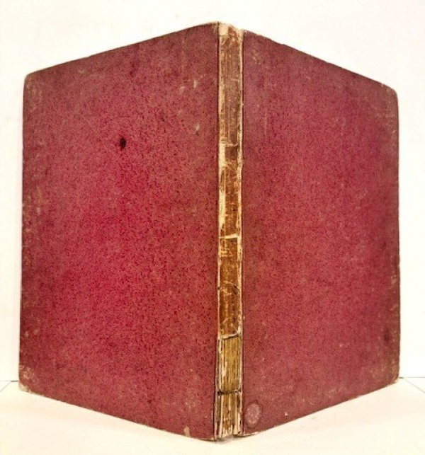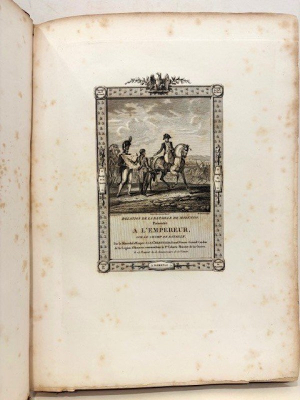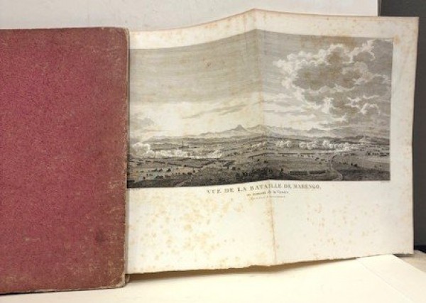 Legatura coeva in cartone spugnato di colore rosa scuro con sciupature e mancanze al dorso. 1 carta bianca; 1 carta non numerata per l'occhiello; un'incisione fuori testo eseguita da Paquet su disegno di Vernet, raffigurante Napoleone a cavallo mentre conversa con Berthier prima della battaglia; 4 pagine non numerate per frontespizio e dedicatoria; 1 tavola sinottica ripiegata con testo "Situation de l'Armée de Réserve"; 40 pagine numerate; 2 pagine non numerate per Errata; seguono 6 tavole incise e ripiegate fuori testo: la prima è 1 carta generale della campagna napoleonica in Italia; 4 carte topografiche di Alessandria e territorio circostante; 1 bella veduta di Marengo, ideata da Bagetti, ripresa durante la vittoria dei francesi. Fedele racconto della battaglia di Marengo (14 giugno 1800) redatto da uno dei suoi principali protagonisti, il pluridecorato generale Alexandre Berthier, ministro della guerra durante il Consolato e capo di Stato Maggiore di Napoleone. Durante la battaglia di Marengo gli fu affidato il comando dell’esercito di riserva. Esemplare completo di questa seconda edizione figurata, la prima nel 1805. Segnali difetti al dorso delola legatura e sporadiche macchie di foxing.