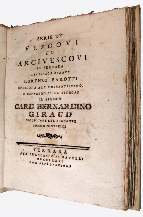 Legatura originale in cartonnage con punti di corda alle cerniere; al dorso, doppio titolo manoscritto da mani diverse e etichetta con numero di collocazione. Frontespizio, 8 pagine non numerate con, alla prima, stemma cardinalizio inciso in testa alla pagina; 159 pagine numerate; 2 pagine non numerate per Errata. Descrizione cronologica dei vescovi e arcivescovi della città di Ferrara fino alla data di pubblicazione. Esemplare genuino in legatura immacolata; all'interno, diverse pagine, soprattutto verso la fine dell'opera, con ossidazioni dell'inchiostro di stampa, piuttosto acido. A fogli ancora chiusi, in barbe.