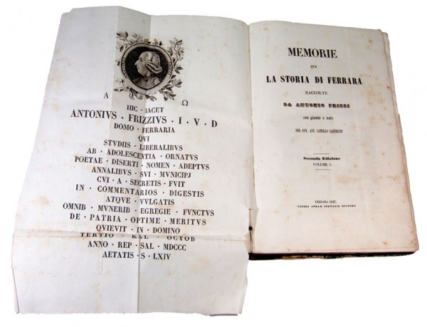 Legatura originale in mezza pelle e carta maculata; al dorso, autore, titolo, numero di tomo e fregi in oro e a secco. Volume I: antiporta con ritratto dell'autore entro occhiello e iscrizione sottostante; XIX pagine numerate, bianco il verso dell'ultima, compresi occhiello e frontespizio; 349 pagine numerate, l'ultima con verso bianco; 2 pagine non numerate di indici; 2 carte geografiche numerate incise e ripiegate; 10 tavole numerate, incise e ripiegate, posizionate in ordine progressivo. II volume: X pagine numerate, compresi occhiello e frontespizio; 77 pagine numerate per Capitolo I; 44 pagine numerate per Appendice Quarta; da pagina 79 a 442 pagine numerate, da pagina 311: Saggio di una bibliografia storica ferrarese compilato dal canonico Giuseppe Antonelli; 1 tavola fuori testo incisa e ripiegata. Volume III: VI pagine numerate, compresi occhiello e frontespizio; 522 pagine numerate; 1 albero genealogico inciso e pi� volte ripiegato. Volume IV: VI pagine numerate, compresi occhiello e frontespizio; 451 pagine numerate, bianco il verso dell'ultima; da 501 a 504 pagine numerate, manca tutto il capitolo degli Statuti di Ferrara; 2 pagine non numerate di Indici, l'ultima bianca; 1 albero genealogico inciso e ripiegato. Volume V: XVIII pagine numerate compresi occhiello e frontespizio; 490 pagine numerate; 2 pagine non numerate per Indicazione dei Luoghi; 1 tavola fuori testo incisa raffigurante due statue di Ercole( non ritrovata in altri esemplari conosciuti, n� citata in indice delle tavole); a pagina 243, 2 grandi tavole incise e pi� volte ripiegate con pianta antica e moderna della citt� di Ferrara. Esemplare completo delle tavole in indice, collocate diversamente da come indicato e con una tavola in pi�; oltre alla mancanza del capitolo sugli Statuti, l'esemplare presenta alcune sporadiche fioriture, dovute al tipo di carta, altrimenti un buon esemplare.