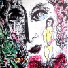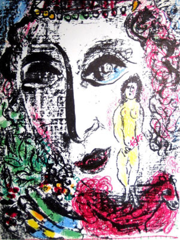 Litografia originale a piena pagina ed a colori impressa su carta Arches. Tavola fuori testo per "Chagall lithographe II". L'inizio della produzione litografica di Chagall risale al periodo di Berlino (1922-1923) ma fu nel 1946, negli Stati Uniti, che Chagall accettò di illustrare "Le mille e una notte": le tredici tavole del volume segnarono i suoi primi passi nella litografia a colori. Di ritorno a Parigi nel 1950, l'artista si recò dallo stampatore Fernand Mourlot, al quale si deve in gran parte il rilancio della litografia nel dopoguerra. Dal 1950 al 1952 Chagall frequentò assiduamente l'atelier di Mourlot dove imparò tutti i segreti del mestiere. Le prove di quel periodo furono stampate in pochi esemplari o distrutte, poiché lo scopo dell'artista non era quello di realizzare opere finite ma di impadronirsi della tecnica. Tra il 1922 e il 1985 Marc Chagall realizzò 1500 litografie. Molte litografie di Chagall furono realizzate con venti / venticinque colori e testimoniano l'enorme lavoro dell'artista: nessuno prima di lui raggiunse una perfezione tale da associare all'ineguagliabile ispirazione la completa padronanza della tecnica. Chagall fece della litografia non un mezzo per moltiplicare le sue opere, ma uno strumento necessario a una creazione che non poteva essere espressa in alcun altro modo. L'artista non realizzò quasi mai bozzetti preliminari per le sue litografie e da ciò derivano l'incanto e la spontaneità creatrice dei suoi lavori. I quattro volumi "Chagall litographe", da cui è tratto il foglio in esame, furono realizzati da Fernand Mourlot e Charles Sorlier (André Sauret editore) tra il 1960 e il 1974. Ogni volume cataloga le litografie realizzate da Chagall in un determinato periodo temporale ed è arricchito da diverse litografie originali inserite nei volumi come tavole fuori testo. Esemplare in edizione corrente, perfetto stato conservativo e margini editoriali.
