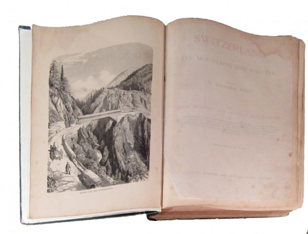 Legatura originale in percallina verde, decorazioni e immagini impresse in oro al piatto anteriore e sul dorso. 487 pagine numerate e numerose immagini incise a silografia, alcune delle quali a piena pagina fuori testo. Prima edizione di quest'opera che descrive le Alpi svizzere, corredata da un significativo apparato iconografico. Esemplare in modeste condizioni, tracce d'usura alla legatura, dorso e cerniere restaurate, ossidazioni ad alcune carte.