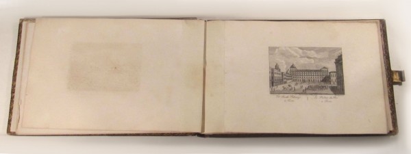 Elegante legatura di epoca romantica in piena pelle con ricche istoriazioni impresse a secco ai piatti e graziosa fibbia in metallo dorato. Frontespizio di epoca posteriore contenente il titolo dell'opera e i dati tipografici. All'interno, 16 raffinate incisioni senza testo al verso, eseguite su matrice di rame all'acquaforte. Le tavole furono opera di Marco Nicolosino per quianto concerne il disegno e di Luigi valperga per l'incisione. Esse rappresentano altrettante vedute del tempo della città di Torino (quattro, il castello di Moncalieri, la Palazzina di Caccia di Stupinigi, il castello di Rivoli e il castello di Racconigi, sono luoghi nei dintorini della città). La raccolta di vedute è databile al 1825, le stesse trovano identico riscontro in quelle disegnate dallo stesso Nicolosino per la seconda parte del grande album "Raccolta di 12 vedute di Torino e contorni", edito nel 1824 dal medesimo stampatore Reycend. Le stampe in oggetto, servirono, inoltre, da modello per illustrare in epoca successiva la celebre guida alla città di Modesto Paroletti "Turin à la portée de l'Etrangere", pubblicata in più edizioni dal 1826 al 1834. Eesemplare in ottime condizioni, dalla particolare legatura; raffinato esempio di quel novero di guide della città di epoca romantica, destinata in questo caso per la particolare raffinatezza esecutiva, alla popolazione colta e ricca della città o ai suoi importanti visitatori. Cfr. PEYROT A., "Torino nei secoli [...]", Torino 1965, vol.I, n.323