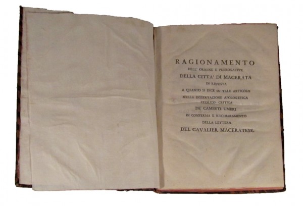 RAGIONAMENTO DELL'ORIGINE E PREROGATIVE DELLA CITTA DI MACERATA. Unito a: ESTRATTO DI PROPOSIZIONI INTORNO ALLA CITTA' DI CAMERINO E SUO ANTICO DUCATO. Unito a: PREFAZIONE DELL'ANNO 1777 OVE ESPONGONSI I PRINCIPJ DELLE PI?? ANTICHE UNIVERSITA' D'ITALIA...