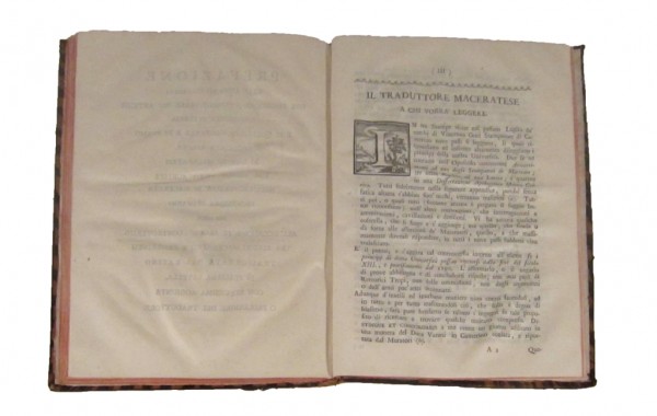 Elegante legatura in piena pelle maculata, sguardie marmorizzate, tagli rossi. Al dorso 5 scomparti ornati con filettature e fregi floreali impressi in oro, tassello in pelle marrone recante il titolo in oro. LXXII; XL, [2]; XXX, [2] pagine numerate. Iniziali e fregi silografati. Interessante e rara opera tripartita dedicata all'origine storica di Macerata, Camerino e delle Universit� di Macerata e Fermo. Esemplare in buone condizioni conservative.