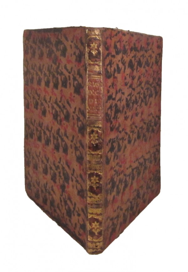 Elegante legatura in piena pelle maculata, sguardie marmorizzate, tagli rossi. Al dorso 5 scomparti ornati con filettature e fregi floreali impressi in oro, tassello in pelle marrone recante il titolo in oro. LXXII; XL, [2]; XXX, [2] pagine numerate. Iniziali e fregi silografati. Interessante e rara opera tripartita dedicata all'origine storica di Macerata, Camerino e delle Universit� di Macerata e Fermo. Esemplare in buone condizioni conservative.