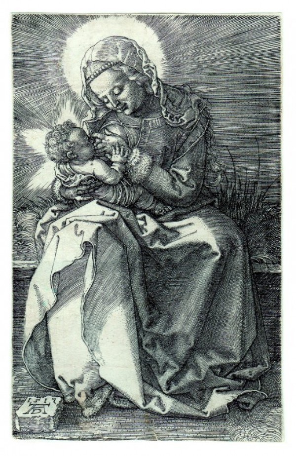 Bulino su matrice di rame, impresso su carta vergellata priva filigrana e databile al primo quarto del XVI sec. Monogramma e data 1519 su un cippo posto all’angolo inferiore sinistro. Stato unico, seconda variante su quattro (Meder 39 b/d). Piccolissimo margine su tre lati, rifilato a quello inferiore con bordolinea presente. Esemplare in buone condizioni, piccolo strappetto richiuso al centro del bordo inferiore, alcune tracce di piegatura al verso, più evidenti le due orizzontali a metà foglio; qualche piccolissima abrasione all’aureola della Madonna, inchiostratura vivida e ben contrastata. PANOFSKY 143 - La monumentalità e la cupezza michelangiolesche sostituiscono qui l’equilibrio raffaellesco di bellezza e solennità della Vergine incoronata da due angeli di un anno o un anno e mezzo prima. Non diversamente da Mosè o dal Geremia della Volta Sistina, la figura della Vergine è rigorosamente formalizzata e appare colossale all’interno della sua stretta cornice. L’inclinazione della sua grande testa, in contrasto con la posa rigida del suo corpo, evoca l’idea di una Pietà piuttosto che di una Madonna. Il paesaggio è completamente soppresso. Il gruppo si stacca dallo sfondo solido come una scultura che sporge da una parete… Engraving on laid paper without watermark, datable to the first quarter of 16th century. Monogram and date 1519 on the lower left corner. Meder 39 b/d. Very narrow margin on three sides, trimmed just on the lower edge with borderline always present. Good conditions, a small tear repaired on the centre of the lower edge, some folding “on verso”, mostly in evidence the two-horizontal folding in the middle, some very small abrasions on the Madonna’s halo, otherwise vivid ink and strong contrasts. PANOFSKY 143 - Michelangelesque monumentality and gloom here replaces the Raphaelesque equilibrium of loveliness and solemnity of the Virgin Crowned by Two Angels of a year or a year and a half earlier. Not unlike Moses, or the Jeremiah of the Sistine Ceiling, the figure of the Virgin is strictly formalized and appears colossal within its narrow frame. The drop of her large head contrasting with the rigid pose of her body evokes the idea of a Pietà rather than of a Madonna. The landscape is entirely suppressed. The group detaches itself from the solid background like a sculpture projecting from a wall…