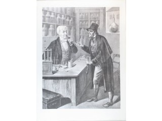 Litografia originale eseguita su foglio imperiale. L' opera eseguita con abile e fine tratto disegnativo, spetta ad un non identificato litografo del XIX secolo. La tavola raffigura l'interno di una farmacia dove un uomo chiede consigli medici al farmacista dietro al bancone, il foglio in esame...