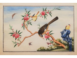 Dipinto originale eseguito su carta di Giappone molto sottile. Il soggetto è racchiuso entro una doppia linea di inquadramento nera. All'interno, fantastica rappresentazione policroma di uccelli, con fiori e magnifiche farafalle miniaturizzate. L'opera è...