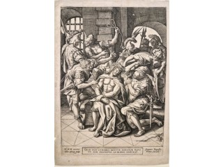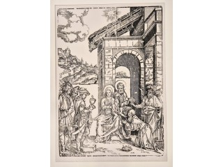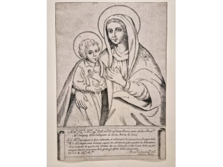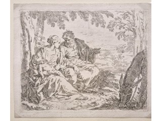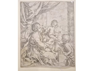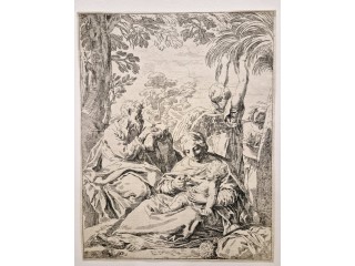 Incisione originale eseguita all'acquaforte su lastra di rame raffigurante un soggetto biblico. Bellissima prova, stato unico, piccoli margini. Carta vergellata con grande filigrana centrale. L'opera raffigura la Sacra Famiglia ritratta durante una sosta nel...