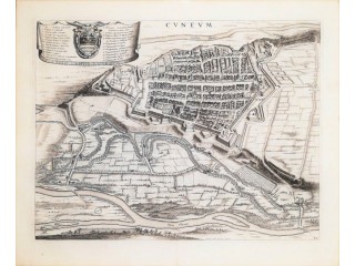 Incisione originale, eseguita all' acquaforte su matrice di rame da un ignoto artefice nordeuropeo, su disegno di Giovenale Boetto (Fossano 1603 o 1604 - 1678) delineato nel 1661. Sotto la linea marginale superiore, al centro titolo, a sinistra cartiglio a foggia di drappo, recante l'arma civica...