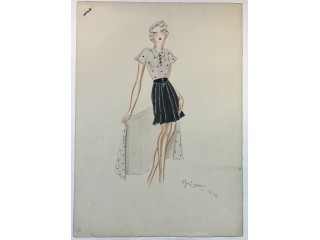Tecnica mista eseguita su carta firmato a matita dall'autore e datato 1936, nella parte inferiore destra. Nota manoscritta sul cartoncino di supporto. L'opera spetta a John Guida, figurinista italiano di madre americana, attivo prevalentemente nel panorama della moda torinese della prima...