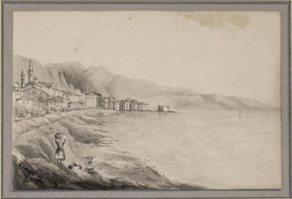 Acquerello originale con interventi a china eseguito su cartoncino, titolo manoscritto al verso del foglio. La tavola in esame è parte di un Album da viaggio, raffigurante diverse vedute della Riviera Ligure di Ponente e della Costa Azzurra, spaziando da San Remo a Monaco. Opera eseguita quasi certamente dal vero, per mano di sconosciuto artista della seconda metà dell'Ottocento, presumibilmente inglese Iin quanto ogni tavola presenta al verso delle indicazioni a matita in lingua inglese e riferita ai luoghi rappresentati. Esemplare in buone condizioni conservative.