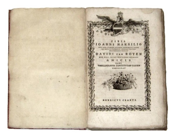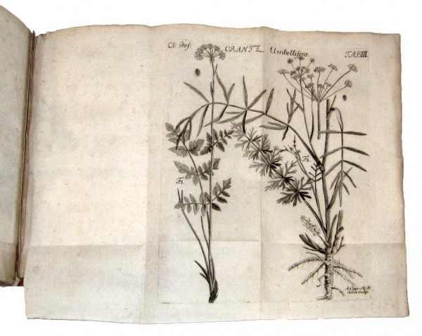 Legatura postuma in carta decorata d'epoca. 125 pagine numerate, VI tavole fuori testo pi� volte ripiegate in fine al volume e numerose testatine incise. Frontespizio con marca tipografica incisa e controfondato con carta di rinforzo, dedica entro cornice a carattere floreale. Rara ed interessante opera botanica dedicata alle Apiaceae (o Umbelliferae, nomen conservandum), famiglia di piante dicotiledoni che comprende circa 3000 specie suddivise in 420 generi presenti in tutte le zone temperate del mondo e caratterizzata da una infiorescenza tipica, l'ombrella. L'autore dell'opera, lussemburghese ma naturalizzato austriaco, fu un apprezzato medico e botanico. Le tavole incise spettano alla mano di Augustin Cipps sia per quanto riguarda il disegno che l'incisione. Esemplare in discrete condizioni, omogenee macchiette brunite lungo le pagine di testo.