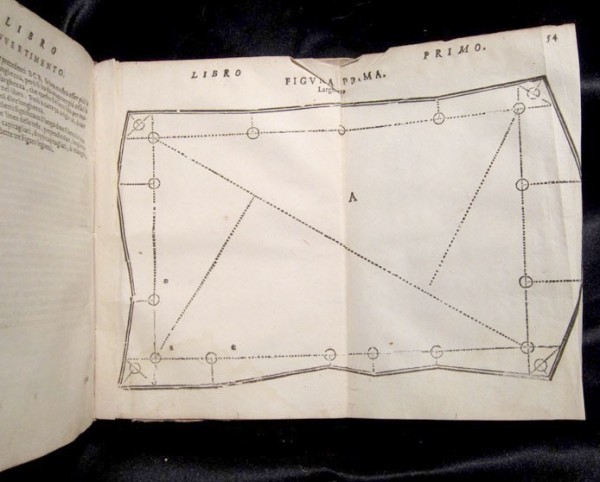 Legatura coeva in piena pergamena floscia con titolo manoscritto longitudinalmente al dorso; al contropiatto anteriore, fitte note manoscritte da antica mano afferenti l'opera; mancanza del foglio di guardia anteriore. 2 carte non numerate, compreso il frontespizio con titolo e bella marca tipografica aldina; 69 carte numerate; 59 carte numerate compreso il secondo frontespizio dell'opera; 2 carte bianche con fitte antiche note manoscritte afferenti l'opera. All'interno, le carte 54-55-56 della prima parte, illustrate e ripiegate; numerosissime illustrazioni tecniche nel testo. L'autore, novarese di nascita, fu matematico e architetto militare; dei suoi lavori fu celebre la fortificazione di Sabbioneta per conto di Vespasiano Gonzaga. L'opera, prima edizione pubblicata nel 1572, è un vasto trattato di agrimensura; nella prima parte si tratta di una serie di applicazioni matematiche per la misurazione dei campi; nella seconda parte, molto interessante, si tratta di come imbottare le granaglie, il vino, il fieno e come livellare le acque. Esemplare in buone condizioni, interno fresco, salvo qualche rara e lieve gora marginale.