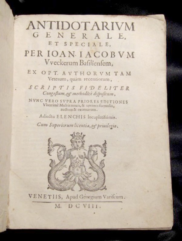 Legatura coeva in piena pergamena con titolo manoscritto al dorso, antico restauro integrativo allo scomparto inferiore del medesimo; alla carta bianca di guardia, antiche note manoscritte di appartenenza privata. 8 carte non numerate, compreso il frontespizio con titolo e bella marca tipografica con una sirena a doppia coda; 111 pagine numerate a 222 colonne (due per pagina); 9 pagine non numerate di indici; 4 carte non numerate, compreso un frontespizio identico al primo; 604 pagine numerate a 1210 colonne (due per pagina); 41 pagine non numerate di indici; mancanza della carta bianca finale di guardia. Nella prima parte dell'opera, dalle colonne 151-52 alle colonne 183-84, numerose illustrazioni a silografia sulla distillazione. L'autore insegnò dialettica e retorica a Basilea, dove nacque, prima di ricevere il dottorato presso la Facoltà di Medicina. La sua dedizione contribuì molto a ridurre il numero di vittime della peste che devastò Basilea nel 1565. Nel 1566 è stato nominato primo medico a Colmar, la città dove morì nel 1586. L'opera, divisa in due parti è un'edizione riunita di due trattati apparsi separatamente a Basilea: l'Antidotarium Generale, nel 1576 e l'Antidotarium Speciale, nel 1577. Il primo trattato comprende un libro sulla distillazione, con numerose xilografie. Il secondo, l'Antidotarium speciale è un voluminoso trattato sui rimedi, dove il vino gioca un ruolo importante. Cfr. Aboca "Come il bibliografo Duveen ci indica, di questo Antidotarium generale et speciale, interessa specialmente la parte che dà le istruzioni per compiere le operazioni chimiche ed illustra vari tipi di apparati alchemici. Ma, come dice il frontespizio, il suo pregio è di prendere fedelmente il meglio degli scritti di "ottimi autori antichi e recenti" e disporre il tutto con metodo. L'elenco di questi autori, già citati nella prefazione, è riassunto a cominciare da pagina 4 ed è tanto incredibilmente vasto da diventare un vero e proprio repertorio. Vi sono inseriti alchimisti antichi come Arnaldo da Villanova, medici antichi come Avicenna, Ippocrate e Mesuè, medici contemporanei come Bartolomeo Quaranta ed il Falloppio, botanici contemporanei come Fuchs e Dodoneo ed altri maestri dell'importanza di Galeno, Fracastoro, Giovanni Battista Porta, Bauhin e Andrea Laguna. Un riassunto enciclopedico con conoscenze trasversali di tutte le materie. Nella prefazione Wecker afferma che i "dispensatori" antichi e moderni sono numerosi, ma le loro diversità inducono ad avere difficoltà nel reperimento pratico dei medicamenti e nella comoda somministrazione. Analizziamo come esempio il termine "aqua": nell'indice ricorre per almeno venticinque volte dall'"aqua somnifera" all'"aqua vitae optima", all'"aqua dentes dealbantes": i temi trattati vanno dalla medicina alla botanica ed alla farmacia.". Esemplare complessivamente in buone condizioni, modesta macchia di inchiostro sbiadito all'angolo superiore di alcune carte nella prima parte; macchiolina con piccola lacuna senza perdita di testo al bordo inferiore della colonna 362, modesto alone all'angolo superiore interno di poche carte verso la fine del volume.