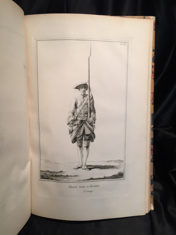 Bella legatura della seconda metà del Settecento, in mezza pelle color amaranto e carta policroma marmorizzata; dorso a sette scomparti, decorato con fasci di filetti alternati a fregi floreali e punti, titolo al penultimo scomparto superiore, il tutto inciso in oro. Frontespizio inciso all'acquaforte su matrice di rame da Baudouin, su disegno di Bouchardon, con elegante cornice recante, alla sommità, profilo di Luigi XV re di Francia entro medaglione; seguono 16 pagine numerate incise su rame, con didascalie descrittive degli Exercises, più un indice inciso delle tavole e un Avertissement sempre inciso, impressi al recto di due fogli. Seguono 36 tavole numerate finemente eseguite all'acquaforte, bianche al verso. Alla tavola num. 1, bel frontespizio figurato eseguito su disegno di Pierre, con in alto la Fama in atto di suonare la tromba e in basso epigrafe nonché scena militare. Al verso dell'ultimo foglio non numerato, antico timbro del possessore, costituito dalle lettere intrecciate "A" e "M". Il volume, in edizione originale, comprende una pregevole serie di stampe di soggetto militare. L'ideatore e incisore dell'opera, il conte Baudouin, fu militare, artista e amatore d'arte: rivestì il grado di colonnello di fanteria e luogotenente dei granatieri nell'esercito francese. Baudouin ricevette l'incarico di eseguire la suite in esame il 6 maggio 1750, da parte di re Luigi XV. Le tavole rappresentano i vari "tempi" in cui sono suddivisi gli esercizi dei fanti francesi. La maggior parte delle raffinate incisioni rappresenta un solo soldato, in atto di manovrare il fucile. Esemplare in ottimo stato conservativo; interno marginoso e fresco.