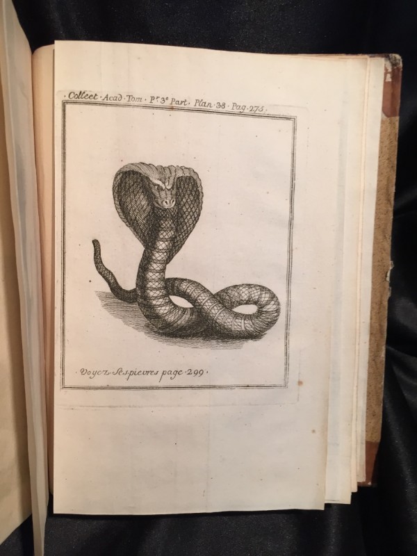 Legatura coeva in mezza pelle con angoli e carta beige; dorso a 6 scomparti con titolo e numero di tomo su tasseli rossi e verdi, eleganti fregi in oro; tagli spruzzati. Tomo I: occhiello, frontespizio con titolo in rosso e nero e vignetta, 4 pagine non numerate; LXXI pagine numerate con testatina incisa da Fessard; 327 pagine numerate, all'interno, 1 testatina e 1 tavola sinottica ripiegata; 30 tavole incise fuori testo e più volte ripiegate. Tomo II: frontespizio con titolo in rosso e nero, 2 pagine non numerate; 599 pagine numerate; 13 tavole incise fuori testo e più volte ripiegate. Tomo III: frontespizio con titolo in rosso e nero; 788 pagine numerate; 19 tavole incise fuori testo e più volte ripiegate. Tomo IV: XLIII pagine occhiello, frontespizio con titolo in rosso e nero; 647 pagine numerate; 35 tavole incise fuori testo e più volte ripiegate. Tomo V: occhiello con titolo in rosso e nero HISTOIRE NATURELLE DES INSECTES TRADUITE DU BIBLIA NATURAE DE JEAN SWAMMERDAM; frontespizio con titolo in rosso e nero, XL pagine numerate; 673 pagine numerate; 36 tavole incise fuori testo e più volte ripiegate. In totale i volumi contengono 133 tavole fuori testo. I tomi in esame rappresentano i primi cinque volumi di una poderosa opera enciclopedica che venne pubblicata lungo tutta la metà del '700. esemplare in ottimo stato conservativo