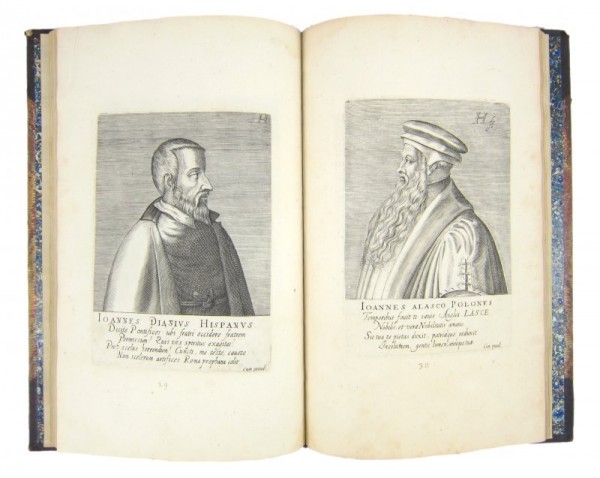 Legatura ottocentesca in mezza pelle con angoli e carta marmorizzata, bordurine in oro ai piatti; data e titolo longitudinale in oro al dorso; tagli dorati; al piatto anteriore, in alto a sinistra, inserto in pelle rossa con numero di collocazione 99, in oro; guardie marmorizzate. 1 carta bianca con grande marca filigranata; frontespizio figurato e inciso con titolo all'interno di edicola; 1 tavola incisa raffigurante un verso latino sormontato da una raffigurazione di  un eclisse, l'universo circostante rappresentato con dei motivi floreali di sfondo; 49 tavole  numerate a penna, fuori testo, incise a bulino e raffiguranti altrettanti personaggi ripresi a mezzo busto con sottostanti il nome e alcuni versi latini riferiti al soggetto; ogni tavola presenta incisa all'interno della lastra la sigla dell'autore  "H" o "Hh". Le bellissime illustrazioni raffigurano personaggi della Riforma Protestante e alcuni altri come Erasmo da Rotterdam e Savonarola. La silloge è rarissima a trovarsi ed è ben completa nel nostro esemplare, non compare nei risultati d'asta degli ultimi 40 anni, Worldcat lo dà presente in sole 4 biblioteche. Esemplare magnifico per la freschezza delle incisioni e soprattutto per i grandissimi margini ( da 2 a 4 cm laterali; fino a 7 alla parte inferiore). Lieve gora a poche carte così come lieve ossidazione, anch'essa a  poche carte. Rarissimo