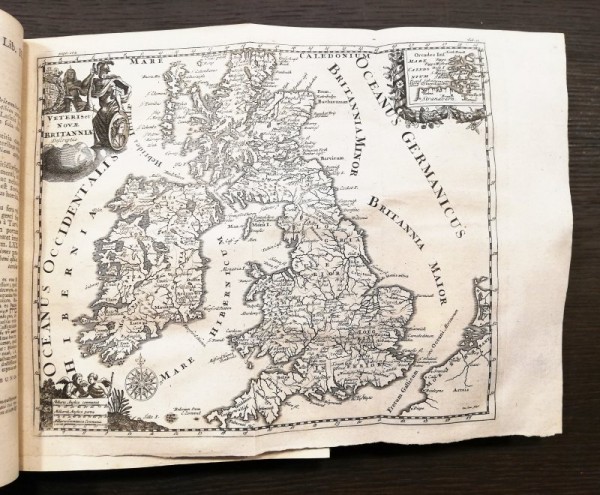 Legatura inglese coeva in vitellino biondo; ai piatti, cornice con cantonali floreali impressi a secco al centro dei piatti; dorso a 5 nervi rilevati con autore e titolo in oro su tassello rosso; tagli spruzzati di rosso; al contropiatto anteriore, ex-libris: "Samuel James Baron Waring". Elegante antiporta figurata incisa da J. Sturt su invenzione di B. Lens. 14 pagine non numerate, compreso il frontespizio; 429 pagine numerate: 1 pagina bianca; 45 pagine non numerate di indici; 1 pagina bianca; 1 carta bianca. All'interno, 57 tavole incise fuori testo, la maggior parte più volte ripiegate. Rappresentano carte geografiche e alcune tavole di costumi o generiche. L'opera compare con un numero di tavole variabile, fino a 61. Nel volume in esame sono presenti sia il mappamondo che la carta dell'America. L'opera ebbe una notevole fortuna tanto da meritare ben 45 edizioni nel corso di cento anni. La prima edizione, senza mapppe, apparve nel 1620; la prima edizione con mappe, nel 1641. Esemplare in buono stato conservativo.