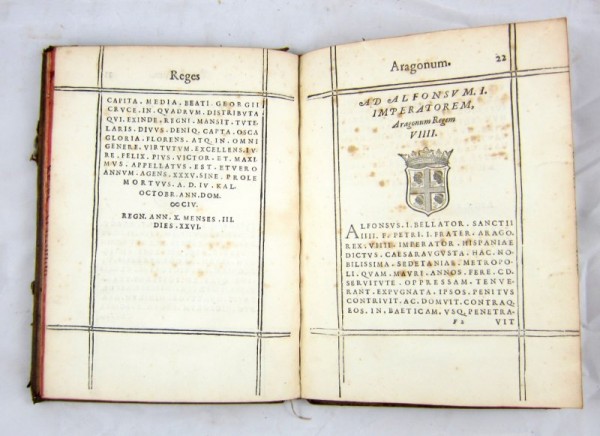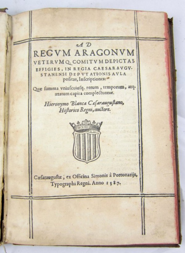 Legatura coeva in pelle scamosciata su assicelle di legno; piatti inquadrati da filetti e diagonali impressi a secco, dorso a 4 nervi rilevati; fermagli deperditi; tagli rossi con tiolo manoscritto a quello laterale. 4 carte non numerate, compreso il frontespizio con titolo e stemma araldico degli Aragona; 40 carte numerate, testo inquadrato all'interno di duplice filetto silografico con titolo all'extra-margine superiore, al recto di ciascuna carta, stemma araldico a silografia. Rara prima edizione, dalle ricerche effettuate risultano essere andati in asta solo 3 esemplari negli ultimi 50 anni. Jeronimo de Blancas,studiò presso l'Università di Saragozza, dove divenne un celbre   latinista e storico. Nel 1581 fu  stato nominato successore di Jeronimo  Zurita quale cronista ufficiale del regno. Autore di numerose opere storiche, il suo lavoro principale è stato Aragonensium rerum Comentarii. Esemplare genuino e in buone condizioni ad ampi margini, lievi tracce d'uso alla delicata legatura, piccola mancanza intorno al capitello inferiore; sporadiche fioriture  e qualche lievissima gora.