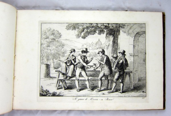Legatura coeva in mezza pelle con angoli e carta spugnata; dorso con autore e titolo impressi longitudinalmente in oro. Frontespizio con titolo inciso; 46 tavole fuori testo incise e numerate (su 50, mancano le tavole n. 32-34-35-49). La tavola n. 50, malamente controfondata con altra tavola di provenienza diversa; seguono altre 2 tavole di provenienza diversa e argomento archelogico. Esemplare in buone condizioni, pur se incompleto, di questa celebre e fortunata opera a carattere costumistico rappresentativa dei costumi romani del tempo.