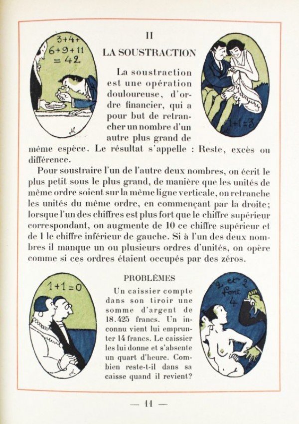 Legatura moderna in mezza pelle rossa con angoli, carta marmorizzata ai piatti. Autore e titolo impressi in oro al dorso a cinque nervi. All'interno brossura originale con titolo, autore e vignetta oltre ai dati editoriali. 80 pagine numerate e 122 vignette illustrate a colori. Esemplare "H.C." con dedica autografa, tiratura limitata a 790 esemplari. Divertente corso di aritmetica "pour les elèves de 20 a 60 ans" dal carattere satirico-erotico, l'opera è copiosamente illustrata da spiritose vignette. Esemplare in eccellenti condizioni.