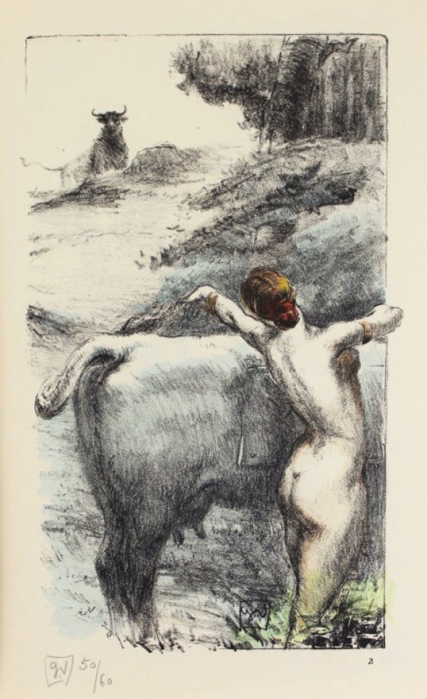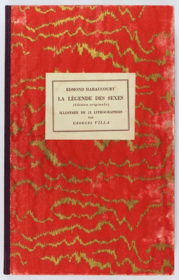 Custodia in cartone con etichetta cartacea riportante autore e titolo al piatto anteriore. All'interno, brossura originale con titolo in rosso e nero. 144 pagine numerate e tre di indice, corredato da una suite di 12 litografie colorate all'acquerello di Georges Villa di soggetto erotico, firmate e racchiuse in copertina di carta con dedica e disegno dell'artista. Dedica manoscritta dell'autore prima dell'occhiello "A Monsieur Paul Bickart...Edmond Haraucourt N° 74 Edition de 1883 Bibliophiles du Cornet". Prima Edizione. Con ogni probabilità questa copia venne donata all'appassionato bibliofilo Paul Bickart durante una cena del "Bibliophiles du Cornet", club fondato da Roger Braun e Gerges Villa. L'autore nella prefazione, con tono un pò disilluso (" dans le coït, rien, à côté, rien "), spiega che la sua intenzione è quella di fare un'epopea del basso ventre. Esemplare in ottime condizioni, completo e accompagnato da illustrazioni finemente eseguite.