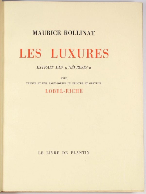 Elegante legatura in marocchino color bordeaux a grana grossa, firmata Flammarion; dorso a 4 nervi rilevati con autore, titolo e data impressi in oro agli scomparti; taglio superiore dorato; ai contropiatti, filetto in oro e copertura in marocchino rosso vivo a grana grossa; guardie in seta bordeaux e carta marmorizzata; custodia coeva in cartone ricoperto di carta marmorizzata e finiture in pelle bordeaux. 3 carte bianche; brossura editoriale in cartoncino color crema con titolo stampato in rosso e nero; 1 carta fuori testo contenente, al recto, disegno originale firmato da Lobel-Riche ed eseguito a matita e sanguigna, raffigurante nudo di donna con, retrostante, figura abbozzata; occhietto con, al verso, giustificazione della tiratura: esemplare Horse Commmerce dei 10 tirati in questa versione, complessivamente furono 210 gli esemplari tirati nelle varie tirature. Frontespizio con titolo in rosso e nero; 123 pagine numerate, nel testo, eleganti testatine capolettera colorati; 2 pagine finali non numerate con, alla prima, dati tipografici; piatto posteriore della brossura editoriale, come anche il dorso della stessa; 2 carte bianche finali. All'interno, 31 acquaforti originali in 4 stati di cui uno in sanguigna; la prima serie di acquaforti, posizionata all'antiporta e raffigurante l'autore, è in soli 3 stati. Esemplare magnificamente conservato, dalla lussuosa legatura firmata, completo del disegno originale per opera di Lobel-Riche.