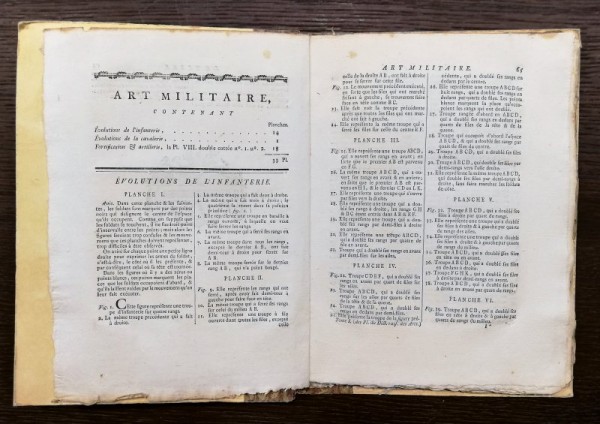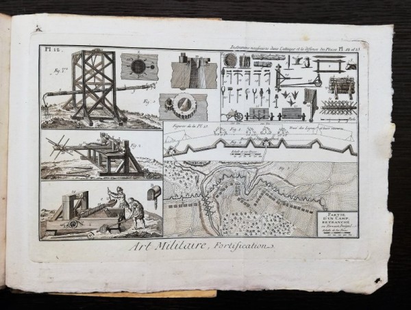 Fasciolo contenente 13 pagine di testo e 17 tavole fuori testo, incise all'acquaforte su matrice di rame, raffiguranti scene a carattere militare, riferite in particolare alla fanteria. L'opuscolo in esame è tratto da un'edizione in formato ridotto della celebre Encyclopedie di Diderot e D'Alambert pubblicata in contemporanea alla "princeps" parigina. Esemplare in buona condizioni conservative, in "barbe".