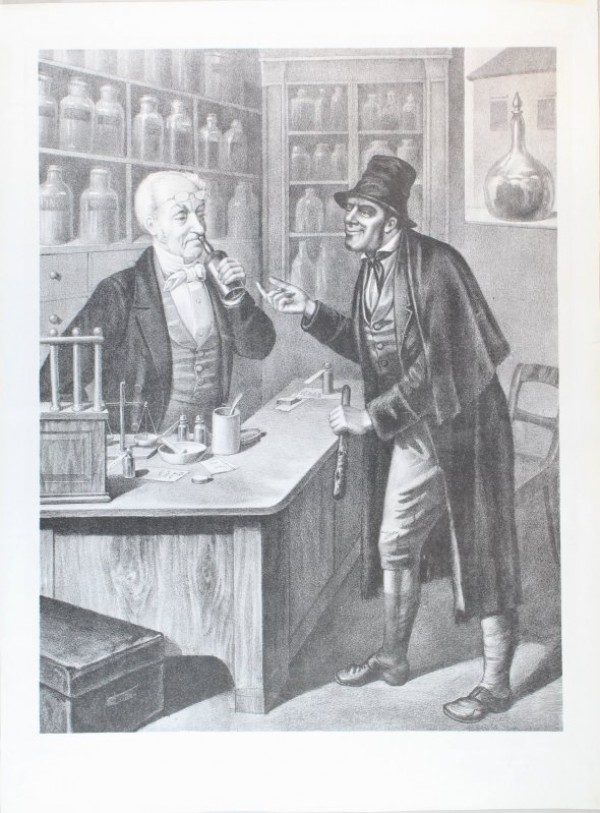 Litografia originale eseguita su foglio imperiale. L' opera eseguita con abile e fine tratto disegnativo, spetta ad un non identificato litografo del XIX secolo. La tavola raffigura l'interno di una farmacia dove un uomo chiede consigli medici al farmacista dietro al bancone, il foglio in esame riprende sia la tradizione della caricatura e degli studi fisiognomici, sia il filone , tipico dell'arte accademica, degli studi sull'espressione delle passioni e occupazioni umane. La scena è ricca di particolari iconografici riferiti al farmacista, professione che vanta antiche origini, anticamente in Giappone vi erano uomini che si potevano raffrontare ai moderni farmacisti, essi venivano rispettati per il loro lavoro. Nell'antica Grecia i rhizotomoi ricercavano e curavano con erbe e radici così come nell'antica Roma dove nascevano le prime vere e proprie farmacie ,Tabernae medicinae, nelle quali la figura del Pharmacotriba non esercitava più la medicina ma vendeva rimedi medicamentosi e realizzava medicamenti composti prescritti da medici. In Italia la figura del farmacista (lo speziale o rizotomo), fino al XII sec. considerato un semplice artigiano al servizio del medico, iniziò ad affermarsi dal XIII sec. come professionista autonomo grazie soprattutto alla volontà dell'imperatore Federico II di Svevia, sovrano colto ed illuminato del Regno di Sicilia, fondatore dell'Università di Napoli che ancora oggi porta il suo nome, promosse fortemente la cultura araba e stimolò gli studiosi ad occuparsi di matematica, scienze naturali ed alchimia. Fu Federico II che separò e regolamentò l'esercizio della professione medica e quella dello speziale. Ben presto anche in altre zone d'Italia, come in Toscana (a Firenze e Siena), in Veneto (a Padova e Venezia), nonché a Roma, Genova, etc., furono fissati i principi fondamentali che regolamentavano la professione (statuti delle Arti degli Speziali). Nel 1400 la "Corporazione degli Speziali" era già considerata una fra le più importanti nella società dell'epoca ed era compresa tra le sette Arti Maggiori. Solo a partire dalla seconda metà del '700 la chimica iniziò ad influenzare la terapia e pertanto nacquero i primi trattati di farmacia e le prime farmacopee, inizialmente tutte in latino; l'antica nomenclatura alchimistica iniziò così ad essere sostituita da quella chimica. Nella farmacopea Sarda del 1853, ad esempio, accanto ad alcaloidi all'epoca recentemente scoperti come atropina, morfina, codeina, etc., era ancora annoverata la "carne di vipera", considerata per secoli una vera panacea. Nascono così le prime vere scuole di Farmacia ed è in questo periodo che inizia a tramontare l'antico nome di speziale ed inizia ad imporsi quello di farmacista, cioè colui che esercita l'arte della farmacopea, ovvero della preparazione dei farmaci. Esemplare in buono stato conservativo.