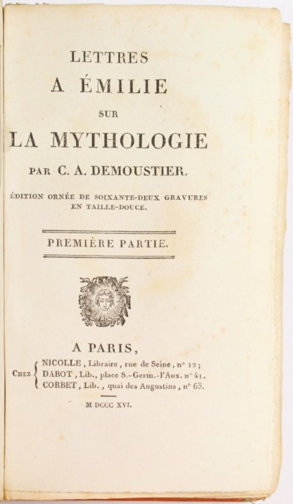 Legatura coeva in piena carta color arancio, decorata a secco con motivi geometrici a tratteggio; dorso liscio ornato da filetti trasversali, con due tasselli in pelle verde scura, recanti titolo abbreviato e numero delle parti dell'opera comprese nel tomo. Risguardi in carta marmorizzata policroma. Occhietto - ritratto dell'autore entro ovale - frontespizio - XVI - 120; occhietto - frontespizio - 102 - (1); occhietto - frontespizio - 144 pagine numerate. Indicazione dell'"imprimeur-libraire" Eberhart al verso degli occhietti. Piccoli fregi silografati ai frontespizi. 62 illustrazioni fuori testo finemente realizzate au pointillé su matrice di rame, da disegno e sotto la supervisione di Choquet: le prime due raffigurano, rispettivamente, il ritratto dell'autore e quello di Émilie entro ovale; le altre tavole rappresentano le favole mitologiche narrate nel testo; diverse immagini sono corredate da un foglio bianco di protezione in carta velina. I tre pregevoli volumi, divisi in sei parti, comprendono la reimpressione di un'opera che ebbe grande successo nel primo Ottocento: si tratta di un repertorio di mitologia articolato in varie lettere che l'autore invia all'amata; la trattazione alterna prosa e versi. In apertura del primo volume, gli editori dichiarano con orgoglio: "Le format in-18 que nous avans adopté, tiré sur grand raisin fin, fournit de belles marges, et présente une espèce de luxe typographique. Soixante-deux cuivres neufs que nous avons fait graver, sur d'excellens dessins, par des artistes distingués [...] nous promettent une réussite complète". Alla prefazione degli stampatori segue una breve biografia dell'autore, dalla quale si apprende (fra l'altro) che fu avvocato e si cimentò nella scrittura di commedie. L'impressione in esame non è citata dallo studioso Graesse. Esemplare in ottimo stato conservativo; leggeri segni d'usura alle legature, con lievi allentamenti alle cerniere; alcune tenui macchie da ossidazione alle carte.