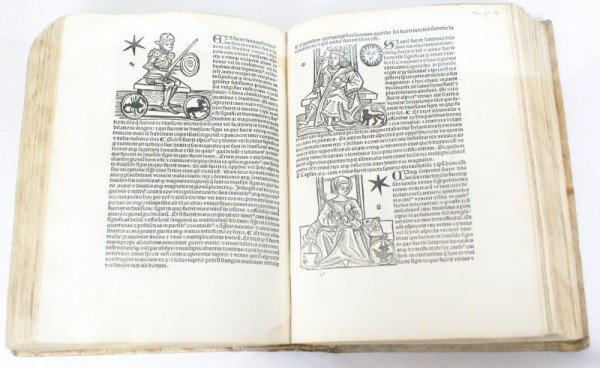 Ancient vellum for reuse; bookplates by F. Hopkinson, Malvern and Wells-Hans Fürstenberg. 1 cb. of a later period with pen annotations. 422 leaves. The first 14 leaves with the side margin slightly shorter by a few millimeters. Inside, there are numerous woodcut engravings depicting initials, diagrams, astronomical symbols and zodiac signs; on the obverse of the last leaf, a magnificent typographic mark of the publisher Ratdolt, impressed in red and black. Collation: [*]14 a-z A-Z AA-EE8 (*1r register title, *1v preface by Canter, *2r tabula, a1r title, a1v blank, a2r text, EE7v colophon, EE8r printer's device, verso blank). This is the first very rare edition of this magnificent incunabulum. The work is heavily based on the writings of Arabic astrologers, Ptolemaic astrologers, and writers of the classical period; a history of magical and experimental sciences. A truly rare work with the Register present, often missing in other copies. Very good impressions inside, clean.
