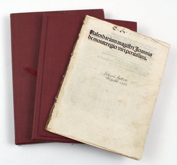 Disbound, modern cloth chemise and case. 30 leaves, printed in red and black, 4 full -page woodcuts illustrating instruments at the end, one with 1 volvelle (of two), 12 woodcuts zodiac symbols, woodcut white-on-black initials, red capital strokes. Seventh edition, first published in 1474. One of his most famous works, the Kalendarium was an innovative calendar that predicted solar and lunar eclipses and calculated the day of the year in which, from 1477 to 1531, Easter would fall. In fact, the text was an updated compendium of the astronomic and mathematical knowledge of the time, and had an openly practical and teaching purpose. Lacking the second volvelle and string pointer, metal pointer missing from final woodcut. Top and bottom margin of title a little creased, a3-7 detached, woodcuts of instruments lightly soiled, light marginal thumb-soiling.