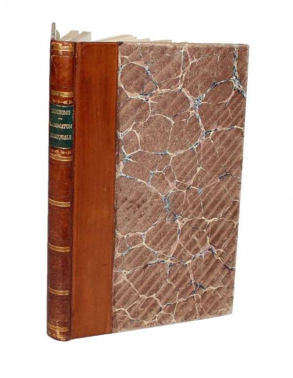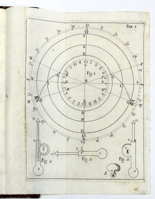 Legatura novecentesca in mezza pelle e carta decorata; titolo e fregi in oro e a secco al dorso. Guardie settecentesche di recupero con note manoscritte avulse dal volume. 8 pagine non numerate, compreso il frontespizio con titolo e una integrazione di qualche centimetro in basso a destra, probabilmente in luogo di un timbro ritagliato; 122 pagine numerate; 15 tavole fuori testo incise e più volte ripiegate. Rara prima edizione originale della descrizione di un orologio meccanico, costruito dall'autore stesso. Cfr. Treccani, "L'orologio progettato dal B. - di cui egli, con l'aiuto dell'artigiano palermitano Domenico Vella, costruì un esemplare che donò al suo convento - presentava la linea delle ore non circolare ma ondulata, e le lancette di lunghezza variabile, per seguire tale linea. La variazione della lunghezza doveva essere effettuata a mano. Per ovviare all'imperfezione, il B. escogitò anche un meccanismo che avrebbe compiuto automaticamente tale operazione, descrivendolo in una appendice aggiunta all'opera. Ma tale meccanismo, ovviamente, era regolato su un particolare corso astronomico, il che ne restringeva l'uso a certe aree geografiche. Per tanto con esso l'orologio perdeva nella generalità d'uso quanto acquistava in comodità. Lo sviluppo successivo dell'orologeria ha mostrato che il presupposto della persistente attualità per gli usi civili dell'antico sistema di misurazione del tempo, su cui il B. fondava la propria opera, era sostanzialmente antistorico. Questa considerazione tuttavia non intacca il preciso interesse tecnico di molte analisi del libro". Baillie pp. 215 - 217: «The author, evidently a competent mathematician, devised a means of arranging a clock to show the unequel hours, or the hours formed by deviding the times between sunrise and sunset, and between sunset and sunrise, each into 12 parts... Unequal hours were used... till quite a late date, and two clocks in the Nürnberg Museum had dials divided to show them. Bonhomo's device is far better than that of either of these clocks». Esemplare, salvo che per l'integrazione al frontespizio e la legatura non coeva, in ottimo stato di conservazione.