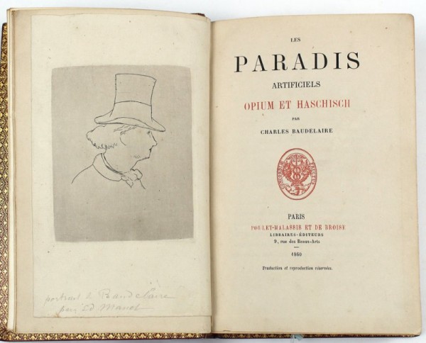 Elegante legatura leggermente posteriore, firmata Canape R.O. in pieno marocchino a grana grossa color mattone; triplice filetto in oro ai piatti; al dorso, 5 nervi rilevati, autore e titolo in oro al penultimo scomparto superiore; a quello inferiore, la data; duplice filetto agli altri scomparti; ampia bordura in oro ai contropiatti; tagli dorati, guardie marmorizzate. All'interno, brossura editoriale conservata in entrambi i piatti. Occhietto; 1 tavola fuori testo di formato inferiore, incisa da Edouard Manet e raffigurante un ritratto di Baudelaire; si tratta della lastra impressa da Salmon nel 1862 ma senza la sigla dell'autore in alto a sinistra; frontespizio con titolo e marca tipografica in rosso e nero; IV pagine numerate; 304 pagine numerate; 2 pagine non numerate di cui l'ultima, bianca. Prima edizione e prima emissione, altre emissioni riportano la data del 1861, "de nombreux exemplaires avec une couverture de relai datée 1861" (Oberlé, 228). Baudelaire era interessato ai fenomeni legati all'uso dell'hashish, così come lo furono anche Nerval e Gautier, tant'è che da giovane Baudelair ebbe a frequentare il celebre "club des Haschischins" nel 1843. Il volume è diviso due parti, la prima contiene il "Poème du haschisch", una sorta di trattato filosofico e in parte scientifico, in cui analizza la scienza, la natura e gli effetti delle droghe orientali. Baudelair definisce il fenomeno come una depravazione dell'infinitezza umana, colpevole dei peggiori eccessi che la porta a cercare dei "paradis artificiel" nell'ashish o nell'oppio. Da qui l'autore traccia una sorta di "monographie de l’ivresse" che queste droghe dispensano. L'analisi è condotta con rigore e senso di un'economia ammirevole che gli permettono anche di indulgere in riflessioni brillanti su arte, poesia, miseria e ansie esistenziali. La seconda parte del volume raccoglie una serie di brani a commento dell'opera di Thomas de Quincey "Les Confessions d’un mangeur d’opium anglais." E' una compilazione e una critica che svelano la straordinaria raffinatezza letteraria di Baudelaire. Sono ammirevoli il rigore dell'analisi, il bello stile, l' intelligenza e la sensibilità con cui approccia le diverse esperienze. Esemplare in ottime condizioni, "in barbe", salvo che per ampia lacuna al fondo di pagina 15, risarcita da restauro.