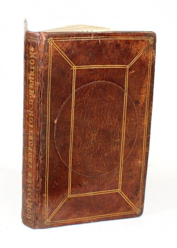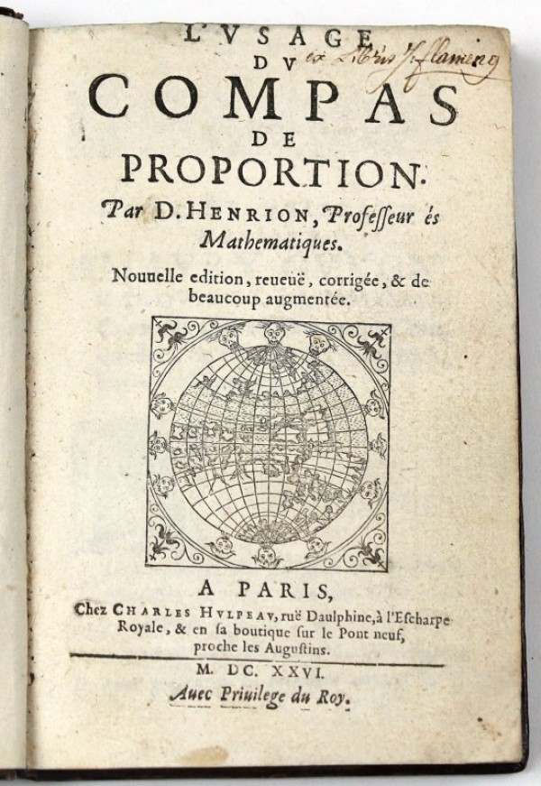 Legatura coeva in piena pelle avana con duplice cornice di doppio filetto con congiunzioni in diagonale e roselline agli angoli in oro; dorso rimontato da restauro con autore e titolo in oro longitudinalmente; al piatto anteriore, traccia di un cerchio segnato da punta di compasso. Al contropiatto anteriore e al recto del foglio di guardia, note manoscritte, un disegnino di un volto femminile capovolto al recto. 1 carta bianca; 8 pagine non numerate, compreso il frontespizio con titolo e bel mappamondo inciso, nota manoscritta di possesso "J. Flamieng"; 1 tavola incisa fuori testo e più volte ripiegata, raffigurante una doppia rappresentazione del compasso; 138 (i.e 136 per errore di numerazione finale) pagine numerate. All'interno, numerose illustrazioni nel testo, alcune a piena pagina; 3 carte bianche finali. Seconda o più probabilmente terza edizione, la prima pubblicata nel 1618. Henrion pubblicò il suo primo lavoro nel 1613, un corso di matematica elementare per l'uso della nobiltà. "Henrion was greatly interested in mathematical instruments, especially in the proportional divider, the invention on which he attributed to Jacques Alleaume, who had constructed several copies of it in Paris " (DSB). [Henrion era molto interessato agli strumenti matematici, specialmente nel divisore proporzionale, l'invenzione che egli ha attribuito a Jacques Alleaume, che ne aveva costruito diversi esemplari a Parigi" (DSB)]. Esemplare in discrete condizioni, lievi tracce d'uso alla legatura; leggermente corto al margine superiore, in particolare al frontespizio dove il titolo è a filio; traforatura di tarlo all'angolo superiore esterno delle prime 40 pagine, non lede il testo.