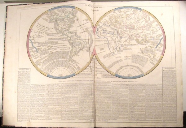 Legatura in mezza pelle zigrinata marrone e carta beige maculata di blu. Dorso con autore e titolo in oro su tassello rosso (con piccola mancanza), eleganti decorazioni in oro . Frontespizio con grande vignetta litografata, 2 pagine non numerate di prefazione, 40 tavole numerate, a doppia pagina, fuori testo di cui la prima raffigura un grande mappamondo storico inciso e colorato all'acquerello d'epoca, ad occupare i 2/3 della tavola; seguono nelle altre carte 18 rappresentazioni geografiche , incise ed acquerellate (alcune con due raffigurazioni affiancate e da noi considerate come una unità). Tutte le carte hanno porzioni di testo riquadrate con cornice ad acquerello. Il volume, è un pregevole atlante storico-geografico: lo studioso Graesse ne cita varie edizioni pubblicate durante gli anni Venti del secolo XIX, e ne attribuisce la vera paternità al conte Aug. Emm. Dieudonné Mar. Jos. de Las Cases. Questi nacque a Las Cases (in Alta Garonna) nel 1766 e morì a Passy-sur-Seine nel 1842: fu ufficiale e restò fedele a Napoleone, tanto che volle seguire l'imperatore nell'esilio di Sant'Elena; il suo scritto più importante è, appunto, Le Mémorial de Saint-Hélène sugli ultimi anni del celebre stratega. Esemplare in buone condizioni, stropicciature alla carta del mappamondo, modesto e piccolo traforo di tarlo all parte inferiore delle prime due carte, due piccole lacune al bordo inferiore destro della carta 12, segni di usura ai labbri e al dorso della legatura.