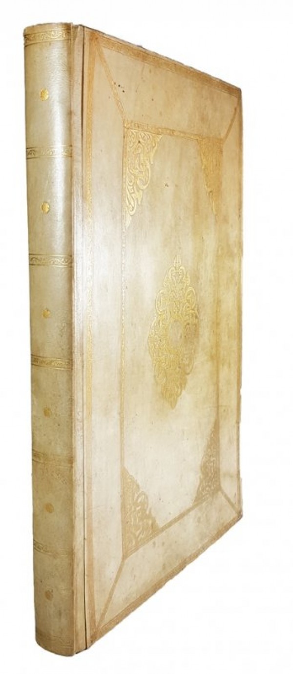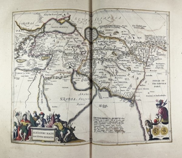 Legatura officinale in piena pergamena e in perfette condizioni; ai piatti, doppia bordura con angolari a quella interna e fleuron centrale in oro; dorso rifatto, liscio con 7 bordure orizzontali  e  6 piccoli fregi in oro agli scomparti; tagli dorati; guardie marmorizzate. Al recto della carta di guardia anteriore, timbro di possesso della "Biblioteca di Pierpaolo Vaccarino".  Frontespizio in rosso e nero e vignetta tipografica colorata alla mano d'epoca, nota di possesso cassata; 16 carte non numerate per Introductio.  49 tavole fuori testo (su 50, manca la tavola Peutingeriana di grandi dimensioni), incise su doppia pagina, alcune con alette di ripiegamento, magnificamente colorate alla mano d'epoca e raffiguranti altrettante carte geografiche del mondo antico, tranne quelle riguardanti la Britannia che sono di concezione moderna.  Seconda edizione, la prima nel 1653 di questo celebberimo atlante di Hornius,  nella variante A con Introduzione di 32 pp. (Variante B: 30 pp.). Esemplare putroppo privo della grande  "Tabula Peutingeriana" che raffigura  l'Impero Romano dalla Gallia al fiume Gange con Roma al centro e con le strade rappresentate come distinte linee distinte. Le tavole sono ispirate all'opera di Abramo Ortelius "Perergon", pubblicate nell'ultimo quarto del XVI secolo.  Esemplare dalla legatura perfetta, pur con rifacimento del dorso assai ben eseguito; la prevalenza della carte di testo e delle tavole in media e forte ossidazione; alcune mende di chiusura di strappi ad alcune delle tavole. Coloritura di grande qualità.