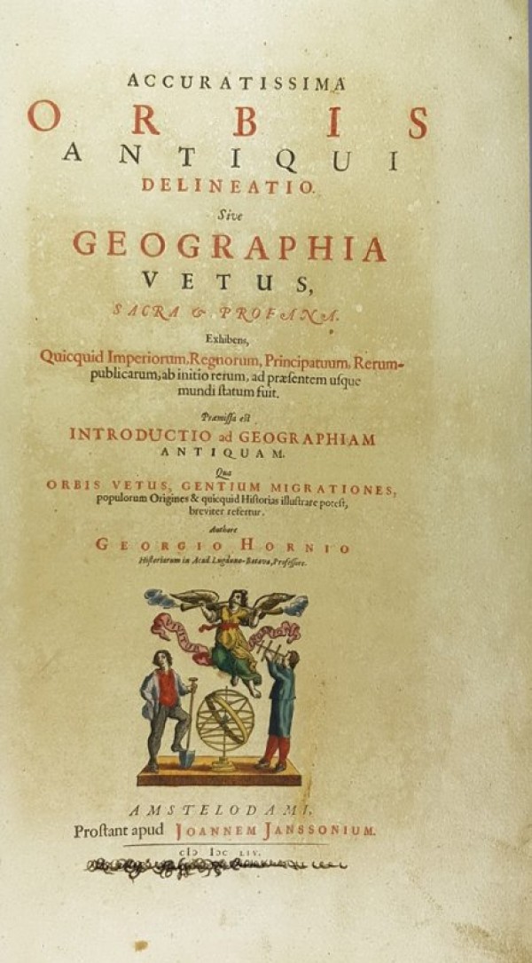 ACCURATISSIMA ORBIS ANTIQUI DELINEATIO SIVE GEOGRAPHIA VETUS, SACRA ET PROFANA. EXHIBENS, QUICQUID IMPERIORUM, REGIONORUM, PRINCIPATUUM, RERUM PUBLICARUM, AB INITIO RERUM, AD PRAESENTEM USQUE MUNDI STATUM FUIT. PREMISSA EST INTRODUCTIO AD GEOGRAPHIAM ANTIQUAM. QUA ORBIS VETUS, GENTIUM MIGRATIONES, POPULORUM ORIGINES ET QUICQUID HISTORIAS ILLUSTRARE POTEST, BREVITER REFERTUR. AUCTORE GEORGIO HORNIO HISTORIARUM ACD. LUGDUNO-BATAVA PROFESSORE.
