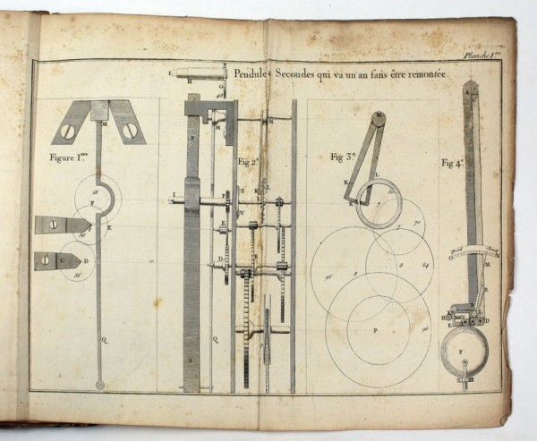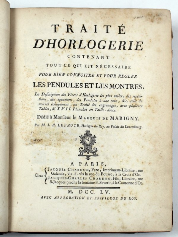 Legatura coeva in piena pelle bazzana con titolo breve in oro su tassello rosso e ricchi fregi in oro al dorso; guardie marmorizzate; tagli rossi. Al contropiatto anteriore, ex-libris di Augustin Seguis. 1 carta bianca; occhietto; frontespizio; XXIV-93-(94 bianca)-(2)- 306-da XXV a XXVIII-da 307 a 308-XXXV (per Tables du Tems Moyen) pagine numerate. XVII tavole numerate incise fuori testo sulla sola parte esterna e ripiegate; 1 carta bianca finale. Esemplare completo di tutte le pagine, delle tavole e delle carte bianche, iniziale e finale; alcune pagine del testo posposte. Prima edizione dell'opera principale di Jean-André Lepaute, considerato ai suoi tempi come il più abile orologiaio di Parigi, il quale fabbricò un gran numero di orologi che adornano gli edifici pubblici parigini e che inventò meccanismi del tutto nuovi per il tempo. Il trattato è suddiviso in due parti; la prima contiene, principalmente, la descrizione di un Pendolo a secondi e di un orologio ordinario, pone il loro confronto, il modo di conoscerli e di regolarli mediante il Sole e le Stelle fisse: (pp. 1 a 93) «qui contient principalement la description d'une Pendules à secondes, et d'une montre ordinaire, leur comparaison, la manière de les connoître, de les finir et de les régler par le moyen du Soleil et des Etoiles fixes ». La seconda parte è dedicata alla descrizione di diversi orologi a pendolo con suoneria, a ripetizione e di meccanismi vari: (pp. 95 a 308) «qui comprend la description de plusieurs Pendules à sonnerie, à répétition, à une roue, à équation ; l'horloge horizontale, les remontoirs, le réveil, etc. L'histoire critique des meilleurs échapemens connus jusqu'aujourd'hui, une explication détaillée des avantages et de la construction de mon nouvel échapement ; un traité des engrenages et du mouvement d'oscillation, des tables d'équation, une table des longueurs du pendule comparées avec la durée des oscillations, etc. ». Belle e interessanti le 17 tavole illustrative. Esemplare in discreto stato conservativo, sciupature alla legatura, in particolare alle cerniere che si presentano fessurate e con piccole mancanze del pellame; antico restauro al dorso con piccole lacune e incollature; sporadiche fioriture o ingiallimenti; le tavole finali leggermente stropicciate al bordo esterno.