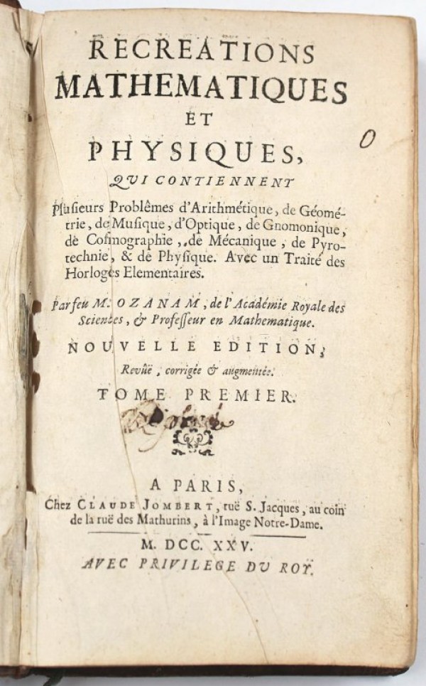 RECEREATIONS MATHEMATIQUES ET PHYSIQUES, QUI CONTIENNENT PLUSIEURS PROBLÊMES D'ARITHMÉTIQUE, DE GÉOMÉTRIE, DE MUSIQUE, D'OPTIQUE, DE GNOMONIQUE, DE COSMOGRAPHIE, DE MÉCANIQUE, DE PYROTECHNIE, & DE PHYSIQUE. AVEC UN TRAITÉ DES HORLOGES ELEMENTAIRES. NOUVELLE EDITION. TOME PREMIER.
