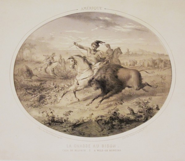 Stampa litografica originale eseguita alla matita; sotto la parte figurata, di forma ovale oblunga, indirizzo degli stampatori, nonché titolo in francese, spagnolo e inglese. L'immagine di buon effetto decorativo raffigura un episodio della caccia al bisonte: l'animale selvatico combatte per sopravvivere all'inseguimento di un nativo americano. Il titolo in tre lingue testimonia la fortuna internazionale di questo genere di stampe, intorno alla metà dell'Ottocento. Esemplare in buono stato conservativo.