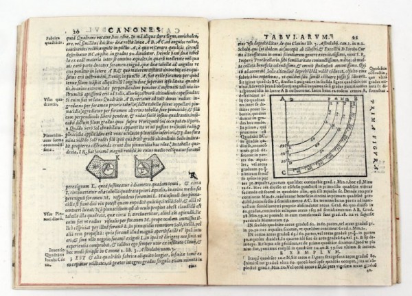 Legatura moderna con pergamena da reimpiego di una pagina di un codice antico; guardie sostituite. 32 pagine numerate, compreso il frontespizio con titolo e diagramma inciso a silografia; all'interno, capolettera, fregi e alcuni diagrammi incisi a silografia. RARA PRIMA EDIZIONE. Il volume concerne lo studio, esplicato in XII tavole, inerente l'alba, il tramonto, la lunghezza del giorno, della notte, etc. alla latitudine del 42° parallelo. Curioso il nome di chi ha sottoscritto nel volume l'attestato che non contiene nulla contro la fede, il maestro di Rossi, il grande matematico e astronomo tedesco Christopher Clavius. Teodosio Rossi di Piperno deve la sua fama soprattutto a una poderosa opera sul calendario, pubblicata a Roma molti anni dopo quella in esame, nel 1637. Esemplare in buone condizioni, alcune delle pagine riferite alle Tabulae, corte al margine laterale esterno; leggera gora alla parte inferiore dalla pagina 24 in avanti.