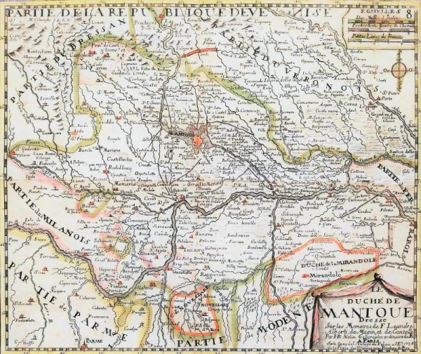 Incisione originale eseguita su matrice di rame, senza testo al verso, con  interventi coevi ad acquerello in più colori. In lastra, in basso a destra, cartiglio con titolo, indicazioni delle fonti del cartografo, nome dell'autore e stampatore nonché data; sempre a destra, in alto,tre scale metriche. La carte geografica, opera di un abile cartografo ed editore parigino, è tratta da una riedizione di un atlante, in cui sono illustrate le campagne belliche recentemente combattute in Italia da Francesi e Spagnoli contro le truppe imperiali. La tavola in esame rappresenta il ducato di Mantova, con porzione di altri territori confinanti.  Esemplare in buono stato conservativo.