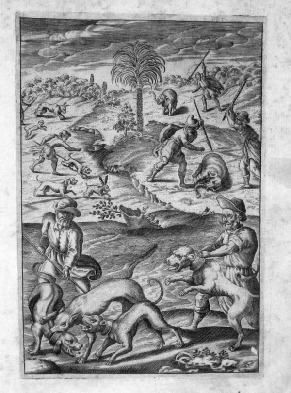 Incisione originale a bulino di rame. La trasposizione su lastra, eseguita con abile tratteggio spetta, secondo il repertorio di Piantanida-Diotallevi-Livraghi, all'incisore N. Pierry. Tavola tratta da un importante e raro trattato di E. Raimondi da Brescia sui vari metodi di caccia e pesca, l'accurata raffigurazione delle tecniche venatorie, ambientate entro dettagliati paesaggi; la descrizione spazia dali animali utilizzati dai cacciatori, quali cavalli, "uccelli di rapina" e cani, agli animali cacciati, sia mansueti che feroci. L' immagine raffigurata, di gusto tardo manierista, è di notevole interesse documentario. Esemplare in buone condizioni conservative.