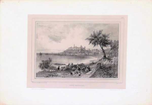 Stampa litografica originale, finemente eseguita alla matita, impressa su carta "chine". Sotto la parte figurata, inscritta entro riquadro tipografico, titolo, indicazioni degli artisti e dati di tipografia. Veduta di Porto Maurizio. La trasposizione su lastra spetta a Cuvillier e, per quanto riguarda le figure umane, da Bayot, sulla base di uno schizzo dal vero di Chapuy. Chapuy ottenne grande successo, soprattutto fra gli anni Trenta e Quaranta dell'Ottocento, come illustratore di volumi con vedute e paesaggi della Spagna, della Francia e dell'Italia. Nelle sue tavole litografiche assecondò la moda dell'Orientalismo e il revival dell'architettura medievale. Tavola tratta da rara ed imponente opera di vedutistica italiana del XIX secolo. Esemplare in buono  stato conservativo.