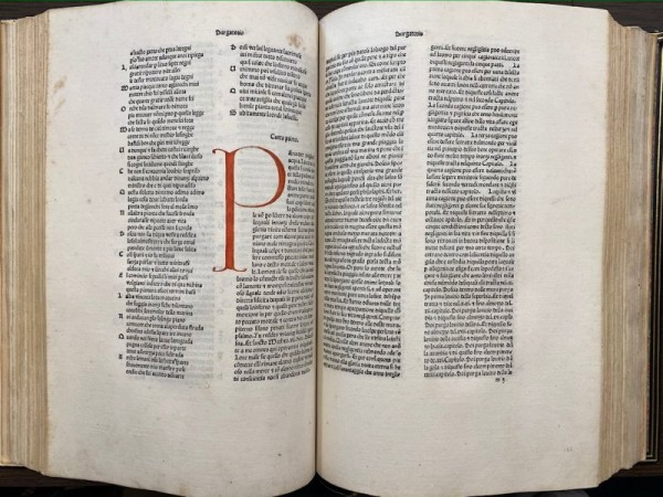 Legatura della prima metà del XX secolo, firmata dal noto legatore francese Charles Meunier (1865-1948),  in pieno marocchino viola a grana grossa, dorso a 4 nervi rilevati, autore e data  in oro a uno scomparto superiore;  ai contropiatti, duplice filetto in oro e guardie marmorizzate.  373 carte non numerate (su 376, mancano le 3 carte bianche in a, a1 a pp12 finale), testo su 2 colonne e 49 linee, carattere (Type): 5:90G.  Collation: á é8; a-i K10 l8; m8 n-s10 t v8 x y10; aa-gg10 hh ii8 KK-OO10 PP.. ( á2r life of Dante,  a2r table of Inferno, a3r Inferno with commentary, m1r table of Purgatorio, m2r Purgatorio with commentary, aa1r table of Paradiso, aa2r Paradiso with commentary, PP8-11 verses by Busone da Gobbio and Dante's son Jacobo, the Credo of Dante and colophon,  373 leaves (of 376, without the 3 blanks á1, a1, and PP12). Letterine rubricate in rosso e blu, alcune molto grandi poste a metà del Purgatorio. Alla seconda carta, antico timbro di possesso "Ex Bibl. Ios. Ren. Card. Imperialis", la biblioteca del cardinale Giuseppe Renato Imperiali (1651-1737), Legato di  Ferrara dal 1690 al 1696, andata dispersa alla fine del Settecento. Al verso dell'ultima carta, fitte antiche annotazioni manoscritte. Diverse chiose manoscritte lungo il volume. Sesta edizione in assoluto  della Divina Commedia e prima edizione con commento, edita a cura di Cristoforo Berardi di Pesaro. Essa contiene inoltre la prima edizione della Vita di Dante del Boccaccio, una delle fonti biografiche dantesche più importanti, del Capitolo in terza rima sopra la Commedia di Bosone dei Gabrielli, del Capitolo, sempre in terzine, di Jacopo Alighieri, figlio del Poeta, e del corpus di opere poetiche attribuite a Dante stesso, ovvero il Credo, i Dieci Comandamenti, i Sette peccati capitali, il Pater Noster e l'Ave Maria.  Il commento è unanimamente attribuito a Jacopo della Lana e non a Benvenuto da Imola, come declamato nel sonetto di sottoscrizione. Cfr. Alai, L’editio princeps del più celebre testo della nostra letteratura - 1472    "...Nel 1477 Windelin von Speyer, celebre stampatore attivo a Venezia, pubblicò quella che è considerata come la prima edizione commentata della Divina commedia. La stampa, curata da quel Cristoforo Berardi da Pesaro che probabilmente editò anche la princeps windeliniana del Canzoniere nel 1470, presenta il commento volgare di Jacopo della Lana (composto nella prima metà del XIV secolo), presentato sotto il nome di Benvenuto da Imola, autore a sua volta di un famoso commento dantesco terminato nel 1380. L’erronea attribuzione è forse intenzionale, se si considera il maggior prestigio che ad un lettore del tempo suscitava il nome di Benvenuto da Imola. L’edizione di Windelin, che riporta per la prima volta anche la Vita di Dante del Boccaccio, è dunque la prima edizione della Commedia realizzata con intenti storico-didattici".     The first Venetian edition of Dante’s poem was also the first to be printed with a commentary. In this case, the commentator is Jacopo della Lana (ca. 1278–ca. 1358), a contemporary of Dante. Della Lana wrote his commentary sometime after Dante’s death, but before 1328. It is considered among the best of the early criticisms along with those of Benvenuto da Imola, Guido da Pisa, and two of Dante’s three sons, Jacopo and Pietro. In this edition, however, the colophon incorrectly attributes della Lana’s commentary to Benvenuto da Imola, perhaps to increase sales through name recognition (cf. Cachey, et al.).  This edition also contains the ?rst printing of Giovanni Boccaccio’s Vita di Dante, or Life of Dante.  Boccaccio (1313–1375), who was only eight years old when Dante died, was among the ?rst of the poet’s defenders to extol his virtues through a combination of commentary, teaching, and textual editing. Attempting to reclaim its exiled native son, the City of Florence commissioned Boccaccio to deliver a series of lectures on Dante beginning in 1373.