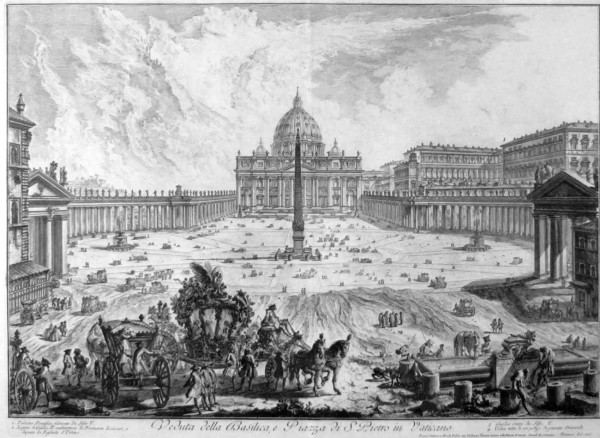 Incisione originale eseguita all'acquaforte su matrice di rame, nel IV stato su 7; tiratura romana su carta vergellata; in lastra, sotto la parte figurata, titolo, quattro richiami, indirizzo dell'autore e prezzo. L'opera appartiene alla serie delle Vedute di Roma, cui Piranesi attese dal 1748 fino agli ultimi anni: in queste tavole il maestro, che � ri ordato come uno fra i massimi incisori del Settecento, intese celebrare la magnificenza della Citt� Eterna, sede degli antichi imperatori e dei papi. L'esecuzione di questa tavola � assegnata da Hind al 1748. La splendida immagine � una delle tavole della suite dedicate alla basilica vaticana. Piazza San Pietro � colta, con senso scenografico, dall'antistante spiazzo in terra battuta, dove sostano una ricchissima carrozza da gala, una carrozza pi� modesta, nonch� gentiluomini e popolani presso un abbeveratoio. Gli edifici in secondo piano e sullo sfondo sono amplificati con un senso di artificiosa dilatazione prospettica; il cielo � caratterizzato da maestose nuvole barocche. Esemplare in ottimo stato conservativo, dalla ricca inchiostratura a pieni margini. Cfr. HIND A. M., "Giovan Battista Piranesi. A critical study [...]", London 1978, num. 3.